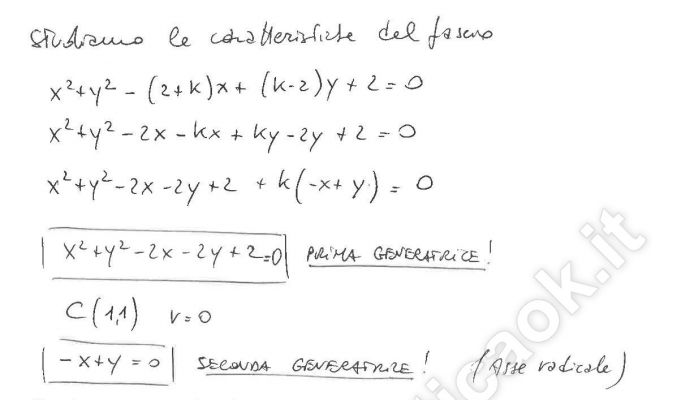 Studia il fascio di circonferenze di equazione x2 + y2 – (2 + k) x + (k – 2) y + 2 = 0 indicando le sue caratteristiche. Trova poi la circonferenza del fascio: a) tangente all’asse x; b) che racchiude un’area 8; c) il cui centro appartiene alla retta y = 2x – 5; d) tangente alla retta y = x – 4.